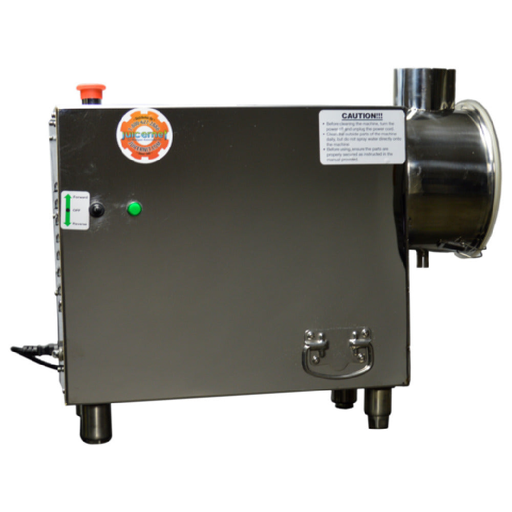 The Juicernet by Mulligan Associates SC4 JuiceMatic Sugarcane Juicer is an industrial-grade fruit and vegetable juicing machine designed for commercial foodservice environments requiring high efficiency. Equipped with a 1/2 HP motor operating at 15 rpm, this gear-driven juicer features four durable stainless steel rollers and a 2-1/4" diameter inlet hole with removable compartments for effortless cleaning and maintenance. Its internal NSF-required seals and bottom plate ensure sanitation, while the magnetic safety switch and overload protection optimize operational safety and equipment longevity—making it an ideal choice for juice bars, cafes, and mid-volume processing facilities focused on reliable, hygienic production.