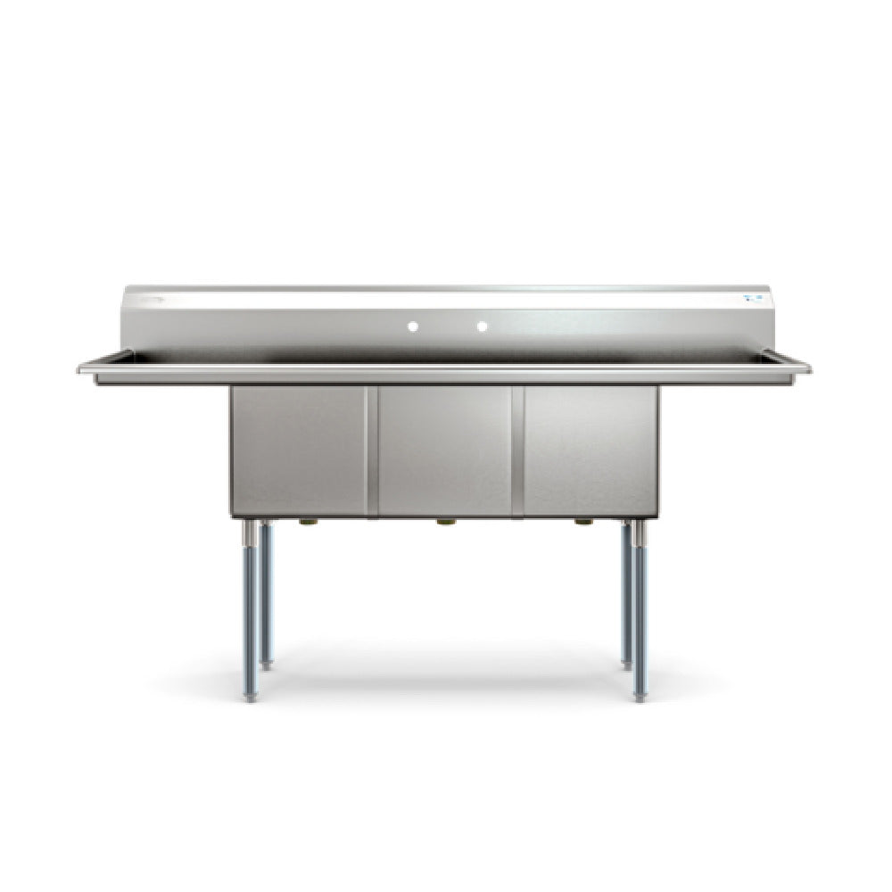 The Koolmore KM-SC151514-15B3 Sink is a commercial-grade three-compartment stainless steel sink designed for high-efficiency foodservice operations. Measuring 75 inches in width, 21 inches in depth, and 43-1/5 inches in height, this unit features three 15-inch wide x 15-inch front-to-back x 14-inch deep compartments, ideal for washing, rinsing, and sanitizing in busy kitchen environments. Constructed from 18-gauge 300 series stainless steel with galvanized legs and bullet feet, it offers durability and ease of maintenance. Equipped with a backsplash, a set of splash mount faucet holes, and left and right drainboards, it facilitates seamless workflow integration in commercial kitchens requiring dependable sanitation and surface durability.