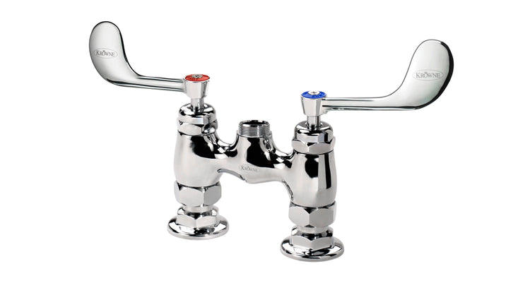 The Krowne 15-4XXL-W Royal Series 4" Center Raised Deck Faucet Body Only With Wrist Blade Handles is a commercial-grade deck mount faucet designed for high durability and vandal resistance. Manufactured by Krowne, this faucet features a 4-inch center to center configuration with ceramic valve technology, ensuring reliable operation. Its robust stainless steel construction and vandal-resistant features make it ideal for demanding foodservice environments such as restaurant kitchens, cafeterias, and institutional food prep stations. The model is engineered for precise water flow control and seamless integration into existing plumbing systems, providing a dependable solution for high-volume washdown and prep tasks.