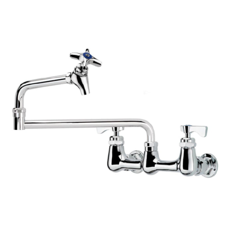 The Krowne 16-252L Krowne Royal Series Pot Filler Faucet is a commercial-grade wall-mounted plumbing fixture designed for efficient replenishment of large cookware in professional kitchens and foodservice establishments. Featuring an 8" centers mounting configuration, this faucet incorporates a durable 18" jointed spout with a shut-off valve, enabling precise control over water flow. Equipped with ceramic cartridge valves and low lead compliance, it ensures longevity and safety, while internal check valves prevent backflow and cross contamination. Optimized for high-volume kitchen operations, it provides reliable performance in busy restaurant or institutional environments requiring continuous water access for large pots and kettles.