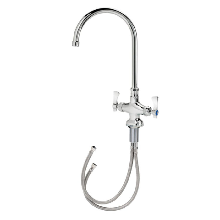 The Krowne 16-302L Krowne Royal Series Double Pantry Faucet with deck mount installation and a gooseneck spout is a commercial-grade plumbing fixture designed for foodservice environments demanding reliable and sanitary water delivery. Engineered by Krowne, this pantry faucet features a robust stainless steel construction with a 4" gooseneck nozzle, ensuring durability and resistance to corrosion. Its low lead compliance meets safety standards, and internal check valves prevent backflow and cross contamination, making it suitable for commercial kitchens, prep stations, and dishwashing areas requiring precise sanitation and water control.