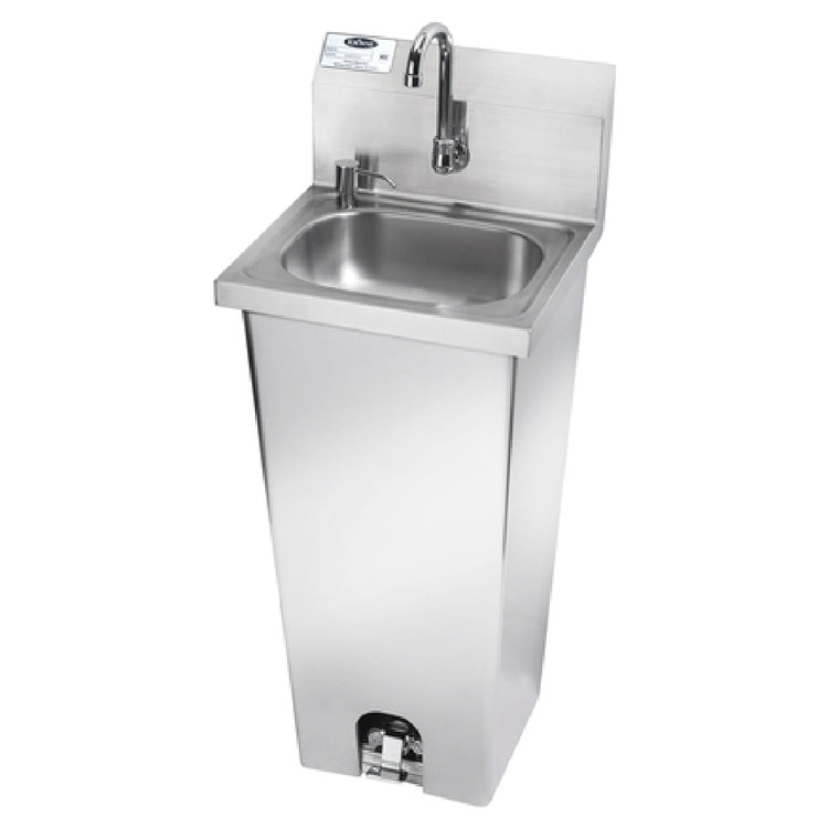 The Krowne HS-14 Hand Sink Pedestal Mount is a commercial-grade wash station designed for foodservice environments requiring durable, NSF-listed hand sanitation solutions. Crafted from stainless steel, this hand sink features precise dimensions of 15-3/4" width, 15-1/4" depth, and 41-1/4" overall height, offering a robust construction suitable for high-traffic kitchens, prep areas, or restrooms. Its built-in 9" deep bowl with front-to-back measurements of 10" provides ample capacity for frequent handwashing tasks, complemented by an 8" high backsplash for splash mitigation. The splash mount gooseneck faucet with foot pedal valve meets low-lead compliance standards, ensuring safe, efficient operation. The unit includes a soap dispenser and mounting bracket for secure installation, embodying an integrated approach to sanitation hardware in demanding foodservice settings.