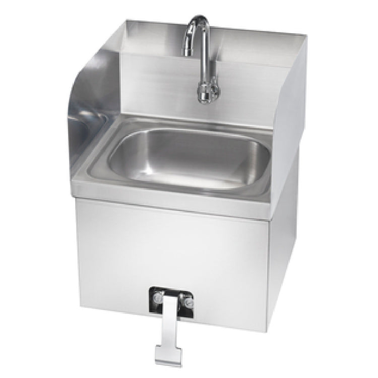 The Krowne HS-41 Hand Sink Wall Mount is a commercial-grade hand washing station designed for efficient sanitation and workflow. This stainless steel unit measures 15-3/4 inches in width, 15-1/4 inches in depth, and stands at a total height of 19-1/4 inches, featuring an 8-inch backsplash for splash protection. Equipped with a splash mount gooseneck faucet and knee pedal valves, it ensures hands-free operation compliant with low lead standards. The sink bowl offers a 12-1/2 inch width, 9-3/4 inch front-to-back dimension, and a 6-inch depth, facilitating quick and thorough handwashing. Its stainless steel construction guarantees durability and ease of maintenance, making it suitable for back-of-house kitchen areas, food prep stations, or healthcare environments requiring robust sanitary solutions.