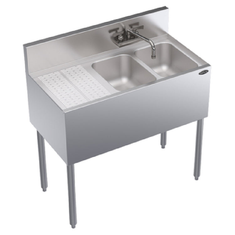 The Krowne KR19-32R Royal Series Underbar Sink Unit with two compartments is a commercial-grade stainless steel sink designed for efficient underbar operations in foodservice environments. Measuring 36 inches wide by 19 inches deep, this unit features two bowl compartments, each measuring 10 inches front-to-back by 14 inches wide, with a durable stainless steel top, front, and sides. It includes a 12-inch embossed integral drainboard on the left side, facilitating water drainage and workspace organization. The unit is equipped with a splash mount Royal Series faucet with a swing spout, conforming to low lead compliance standards. For optimal sanitation and maintenance, it comes with two removable overflow standpipes, stainless steel legs with adjustable thermoplastic bullet feet, and NSF approval for commercial use. This underbar sink is ideal for mid-volume bar and restaurant applications requiring reliable durability, efficient drainage, and seamless workflow integration.
