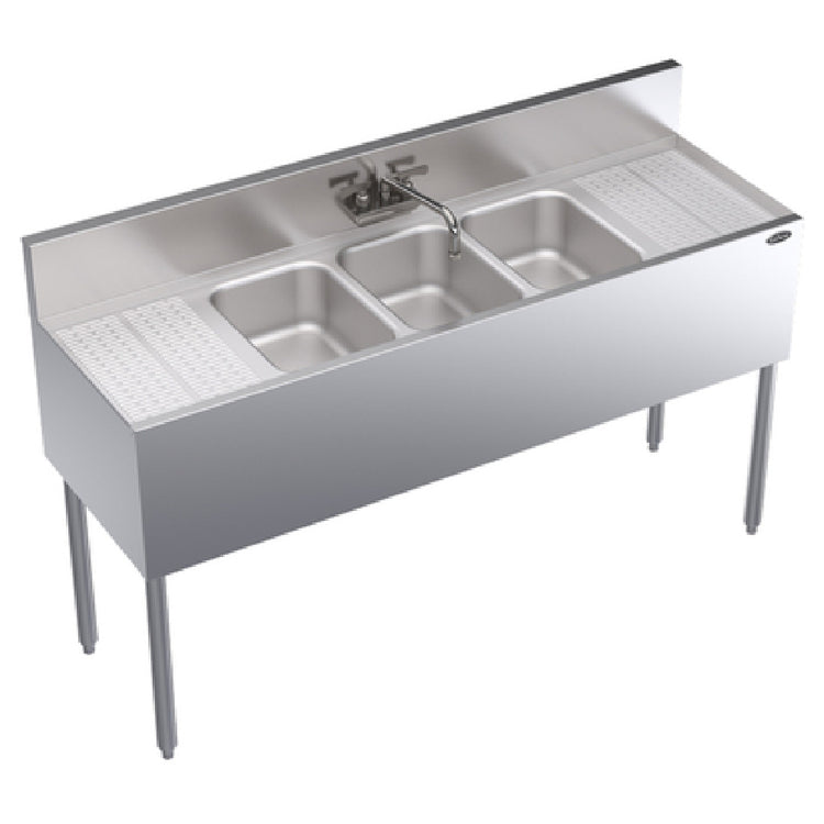 The Krowne KR19-53C Royal Series Underbar Sink Unit is a commercial-grade, three-compartment underbar sink designed for high-efficiency beverage and bar service in professional foodservice environments. Measuring 60 inches wide by 19 inches deep, it features three 10-inch wide by 14-inch front-to-back by 10-inch deep stainless steel bowls. The unit includes 12-inch embossed integral drainboards on each side, facilitating efficient workspace organization and drainage. Its construction with stainless steel top, front, ends, and legs ensures durability, ease of cleaning, and resistance to corrosion, making it ideal for busy bar areas, catering kitchens, and restaurant service bars. The robust splash mount Royal Series faucet with swing spout enhances workflow, while the removable overflow standpipes simplify maintenance. Designed for heavy-duty commercial use, the KR19-53C is engineered to withstand the demands of high-volume foodservice settings.