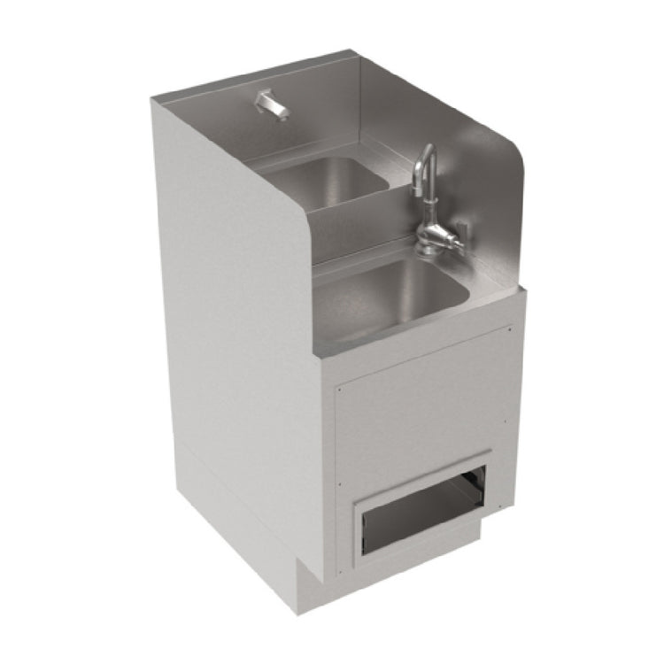 The Krowne KR24-HX18-E Royal Series Underbar Hybrid Hand/Dump Sink is a commercial-grade underbar hand sink unit designed for high-performance foodservice environments. Measuring 18 inches in width and 24 inches in depth, this free-standing stainless steel sink features two 8" x 13" sink bowls that match standard speed rail depths. Equipped with an electronic hand sink faucet, lever style dump sink faucet, deck-mounted soap dispenser, and front-mounted multifold towel dispenser, it provides essential workflow integration for busy bar and beverage stations. Crafted from durable stainless steel, it optimizes sanitation, ease of maintenance, and reliable performance in demanding commercial settings.