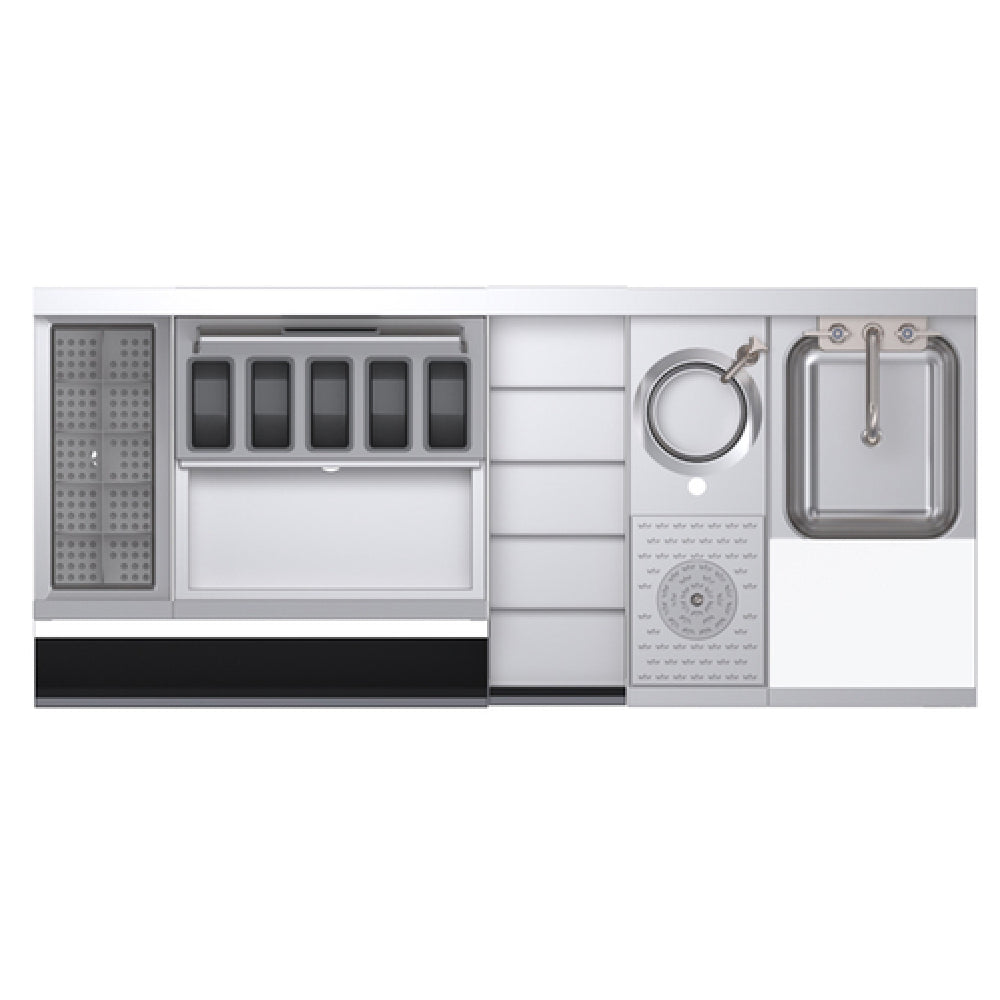 The Krowne KR24-MX54 Royal Series Single Zero-Step Speed Station is a commercial-grade underbar and cocktail station designed for high-performance beverage service environments. Crafted from stainless steel and galvanized materials, this 54-inch-wide unit features a 36-1/2-inch overall height with a 30-inch working height, ideal for efficient bar workflows. It incorporates an 8-inch insulated bottle section, an 18-inch ice bin, along with a garnish tray or sliding cover, facilitating streamlined ingredient organization. Additional features include an 8-inch five-step liquor display, a 20-inch dump sink with a glass rinser, a tool caddy, and a cutting board with pressure regulator, all contributing to rapid replenishment and service. This model's robust construction and precise dimensions support high-volume beverage preparation, making it suitable for busy bar settings and hospitality operations requiring durability and reliable performance.