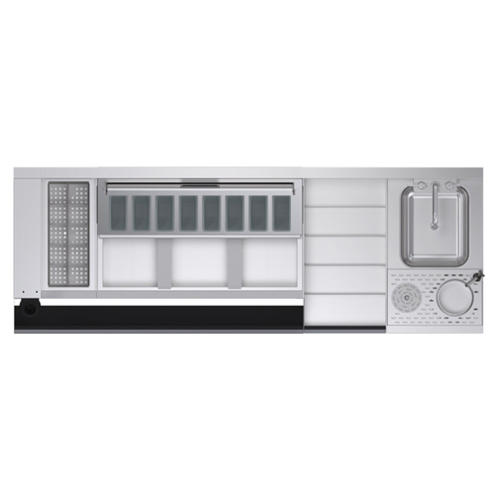 • Included accessories: Ice bin dividers, garnish tray, sliding cover, and tool caddy support workflow