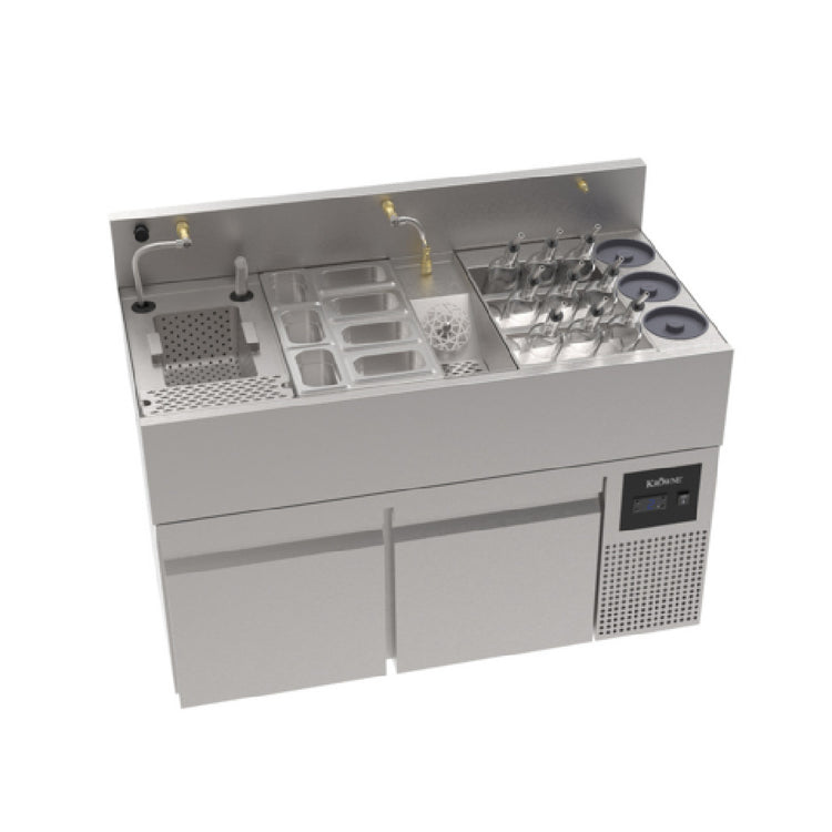 The Krowne MW48R MoveWell Adaptive Station Bin With Ultra Low-Profile Refrigerated Base is a commercial-grade underbar ice and beverage station optimized for professional foodservice environments. Designed with stainless steel construction, this modular unit measures 48 inches wide by 24 inches deep and stands at a height of 36-1/2 inches, providing a durable, corrosion-resistant platform for refrigeration and storage. Its key feature is the ultra low-profile refrigerated base, enabling seamless integration under counter or bar areas, while the pull-out drawer facilitates efficient access and cleaning. Equipped with three Speed Swap plumbing quick disconnects in the backsplash, this model offers interchangeability for fast setup and maintenance in busy hospitality operations. The unit includes a 1-inch drain for effective drainage, making it suitable for beverage prep stations, cocktail bars, and foodservice setups requiring reliable, compact refrigeration with precise dimensions and durable stainless steel materials.