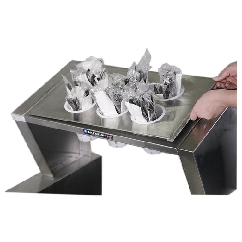 Designed for medium-duty operations, this commercial flatware & tray cart from Lakeside manufactured with durable stainless steel, features versatile mobility and organized storage, suitable for various high-volume foodservice applications. The Lakeside 155043 offers reliable performance in busy kitchens and catering environments, supporting efficient workflow and sanitation across service stations.