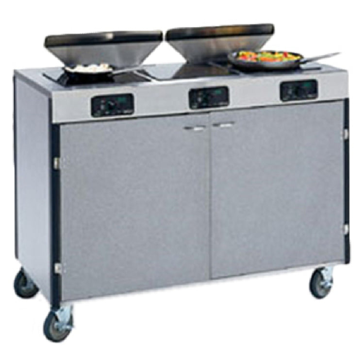 Lakeside Manufacturing, 2085, Creation Express™ Station Mobile Cooking Cart, 48" x 22" x 40-1/2"H, temperature range 90° - 440°F, LED control panel, (3) induction heat stove, (2) down draft filtration system, laminated front & ends, stainless steel top, stainless steel interior with laminated exterior, with doors, 5" swivel No-Mark® polyurethane casters (2) with brakes, ETL, Made in USA