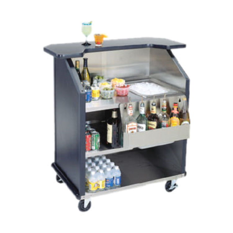 The Lakeside 76884 Portable Bar is a commercial-grade mobile beverage station designed for professional foodservice environments. Measuring 43-3/8 inches in width, 27-1/2 inches in depth, and 46-1/2 inches in height, it features a waterproof laminate top over a stainless steel exterior, ensuring durability and ease of maintenance. Equipped with stainless steel work surfaces, an integrated inner cabinet, one ice bin, and a 7-bottle speed rail, it offers practical solutions for bar setups in hospitality settings such as catering events, restaurants, and event venues. Its robust construction supports efficient workflow with precise dimensions and materials optimized for high-volume, professional use.