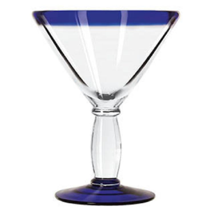 The Libbey 92305 Cocktail Glass 10 Oz. With Cobalt Blue Rim And Foot is a commercial-grade beverageware piece designed for professional foodservice environments. Crafted from high-quality glass, this hand-blown cocktail glass features an anneal-treated construction for enhanced durability and thermal resistance. With a precise capacity of 10 ounces, it is suitable for bartenders and catering establishments seeking consistent presentation. Its cobalt blue rim and foot add a distinctive aesthetic, making it ideal for establishments prioritizing both function and visual appeal in cocktail service. Dimensions include a height of 6-3/8 inches and a width of 5-1/8 inches, with a weight of 15.19 lbs per case, suitable for high-volume use.