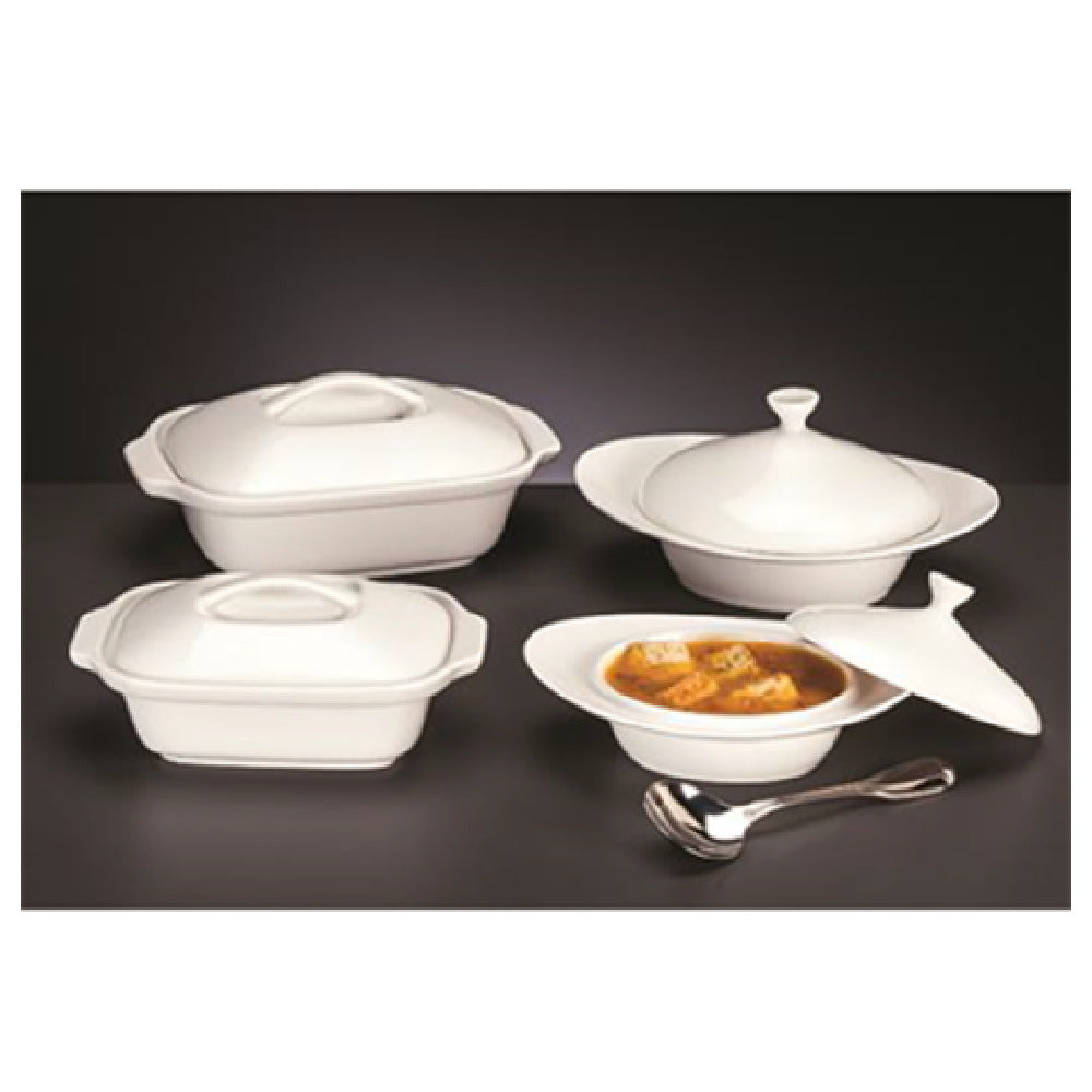 This foodservice crock offers superior thermal resilience through porcelain construction, enabling oven and microwave compatibility—ideal for medium throughput kitchens requiring quick heat-up and temperature retention. Its full vitrification prevents liquid absorption, boosting durability and sanitation ease. The polished foot enhances stability during handling and transport, while its oval shape maximizes operational space. Designed for dishwasher-safe cleaning, it streamlines workflow in busy culinary environments, supporting consistent presentation and easy maintenance across multiple service cycles.