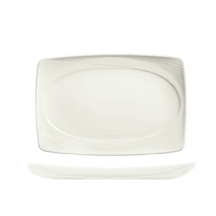 This rectangular porcelain platter provides a durable, chip-resistant surface suitable for high-volume food presentation in busy restaurant or catering settings. Its fully vitrified construction ensures longevity, while the embossed rim adds an aesthetic touch with enhanced structural integrity. The 13" x 9" size supports versatile serving options, and its smooth surface allows for straightforward cleaning and maintenance. Optimized for quick handling and stacking, it facilitates efficient workflow during meal service and presentation tasks, particularly in banquet or buffet setups.