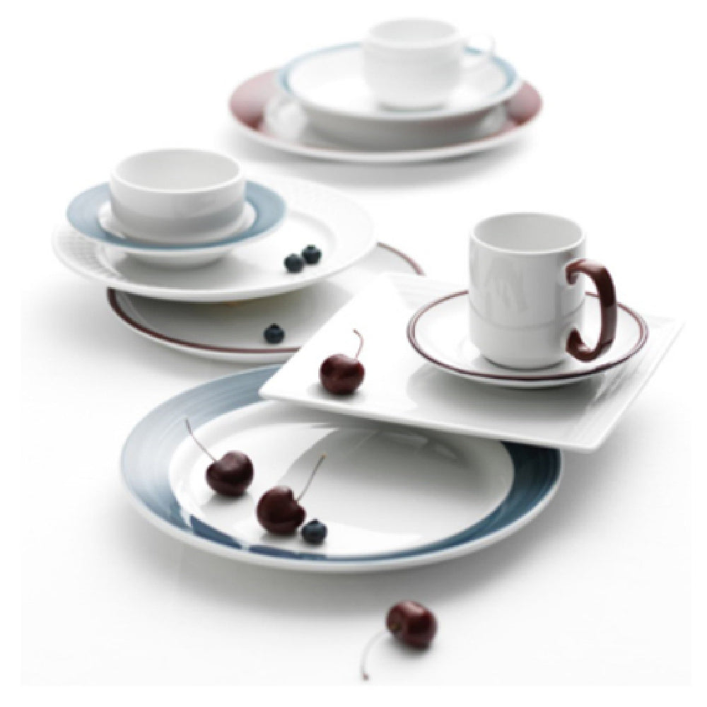 The Libbey 999024500 (Formerly Syracuse China) Saucer is a commercial-grade porcelain piece designed for professional foodservice settings. Measuring 6 inches in diameter and 1 inch in height, this round saucer features a highly polished foot and a fully vitrified Microban® glaze that enhances durability and sanitation. Its distinctive Rigel® Banded pattern with Lunar White body and steel blue accents offers an aesthetically refined presentation suitable for fine dining environments, restaurants, and catering operations. Built for high-volume throughput, this saucer provides precise fit and ease of stacking, making it an essential component for efficient dishware workflows in hospitality venues requiring resilient, restaurant-ready porcelainware.