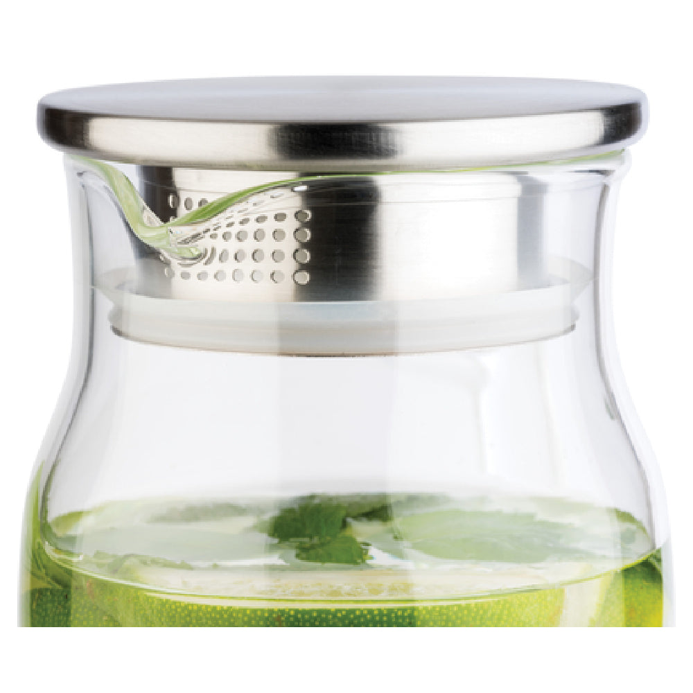 The Libbey APS 10792 Carafe is designed with a 50-3/4 oz. liquid capacity, fabricated from high-quality glass for clarity and durability. It measures 4 inches in length, 5-5/8 inches in width, and 10-1/4 inches in height, with a weight of 1.35 lbs. for stability during use. The dishwasher safe construction ensures ease of cleaning, with a stainless steel matte finish on the lid that includes an integrated strainer for beverage filtration. Its design supports cold and hot beverage applications, operating safely within typical kitchen temperature ranges. The product is compatible with standard commercial beverage service workflows, providing a reliable solution for high-volume environments requiring precise pouring and filtration.