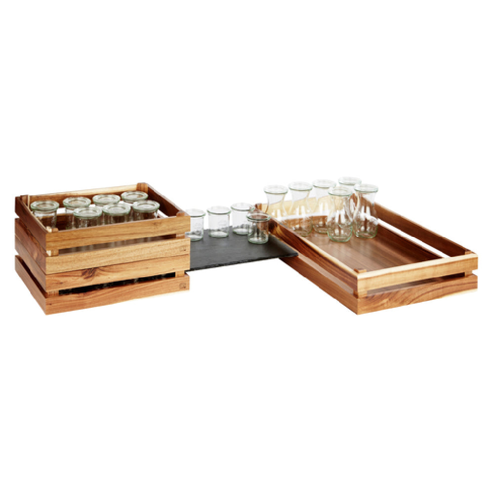 A commercial serving and display crate is a durable, purpose-built container designed for organizing, presenting, and supporting food and beverage items in high-volume foodservice environments. Made from robust materials like acacia wood, these crates provide stability and ease of handling for various service setup needs. The Libbey APS 11621 Superbox Foundation, in particular, functions as a stacking platform or riser that accommodates GN 1/2 pans, enhancing presentation efficiency in commercial kitchens, catering operations, and beverage stations. Its precise dimensions and stability features make it ideal for supporting heavy loads while facilitating quick setup and maintenance in fast-paced foodservice venues.