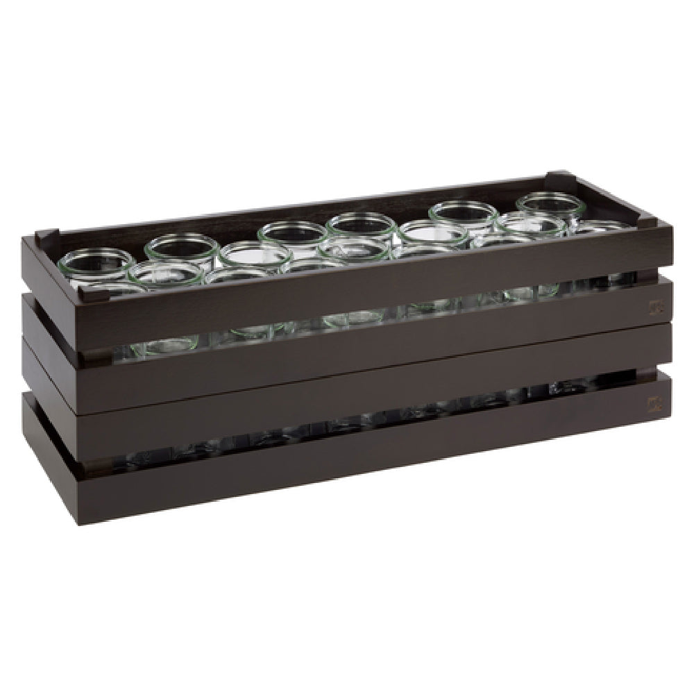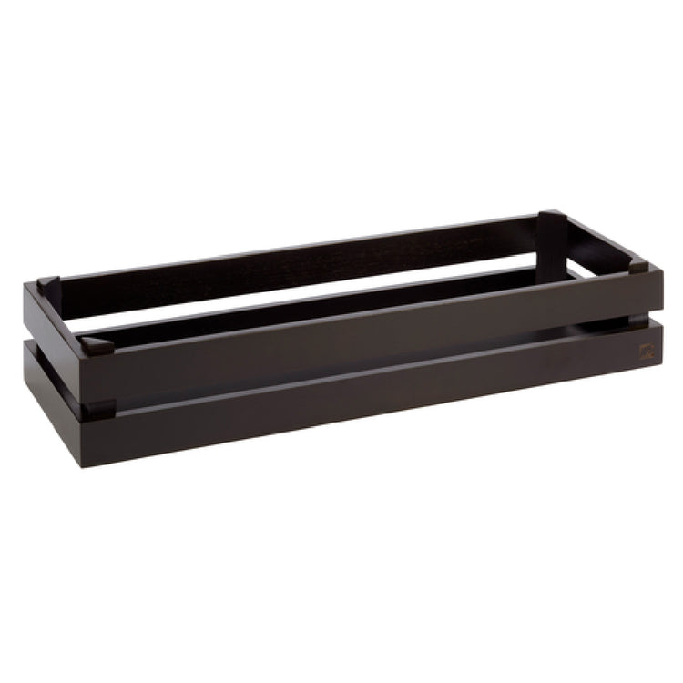 The Libbey APS 11629 Superbox Foundation features a straightforward construction with dimensions of 21-7/8 inches in length, 7-3/8 inches in width, and 4-1/4 inches in height, with a weight of approximately 3.53 pounds. Made from acacia wood with a black finish, it ensures a sturdy, slip-resistant surface suitable for high-use environments. The unit is designed to withstand typical foodservice conditions, including cleaning and handling, with the overall build supporting multiple stacking cycles. It does not require electrical or refrigeration components and complies with Proposition 65 standards. Its compact form factors into optimized storage space, with a freight class of 60, supporting efficient logistics. The item is available and typically ships within 1 to 2 days.