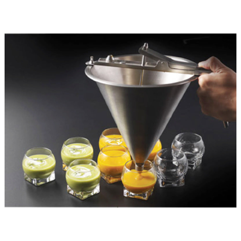 A commercial confectionery funnel is a stainless steel tool used for transfer and piping of liquids and semi-solid ingredients in professional kitchens. It typically features a large capacity, precise flow control via various nozzle sizes, and durable construction suitable for high-volume bakery, pastry, and candy applications. Installed in bakery stations or filling lines, this funnel supports consistent ingredient placement, enabling efficient workflow in confectionery production and pastry decorating tasks. The Matfer 258825 confectionery funnel is ideal for mid-volume bakery operations requiring reliable transfer tools for smooth and precise piping processes.