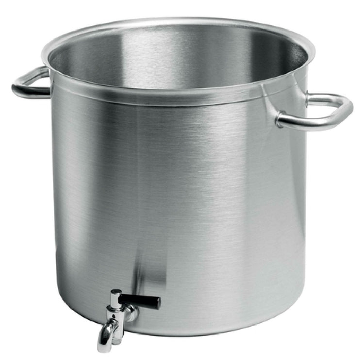 A commercial stockpot is a heavy-duty cooking vessel designed for large-volume food preparation in professional kitchens. It typically features a durable construction, large capacity, and specialized fittings like faucets for drainage, facilitating efficient batch cooking and ingredient transfer. The Matfer 694324 Bourgeat Excellence Stockpot is an example of a high-capacity stainless steel model with precise specifications, supporting operations such as bulk broth, soup, or sauce production essential for large-scale foodservice outlets and institutional food operations.