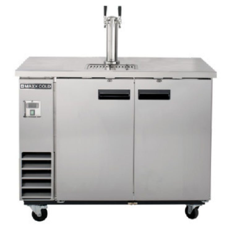 The Maxximum MXBD48-1SHC Maxx Cold X-Series Keg Cooler with Single Tower & Dual Faucets is a commercial-grade draft beer cooler designed for high-performance beverage dispensing in professional foodservice operations. Featuring a two-section, self-contained refrigeration system with a side-mounted compressor, this unit measures 48 inches in width and offers a capacity of 10.5 cubic feet, capable of maintaining temperatures between +34°F and +41°F. Its stainless steel exterior and stainless steel top provide enhanced durability and sanitation, while two solid hinged locking doors ensure security and ease of access. Equipped with a 3-inch stainless steel draft tower with dual faucets, it supports efficient service for high-volume settings, making it suitable for bars, restaurants, and hospitality venues seeking reliable, commercial ice-cold beer storage and dispensing solutions.