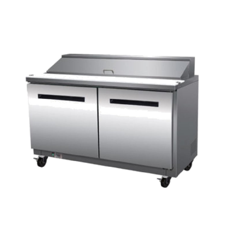 This refrigerated counter features a self-contained, rear-mounted refrigeration system utilizing R134A refrigerant, with a 1/2 HP compressor generating reliable cooling. Its dimensions are 48.2" wide by 34.5" deep and 43.2" high, supporting a 12 cubic foot capacity across two sections. Constructed primarily from stainless steel with a painted aluminum interior, it ensures optimal durability and sanitation. Operating at a voltage suitable for standard commercial setups, it employs an air-cooled refrigeration method that maintains consistent temperatures within safe ranges. The unit weighs approximately 313 lbs, contributing to its stability and robust performance. Additional features include cULus and UL EPH classification, with doors for easy access and cleaning, and included accessories such as cutting boards and polycarbonate pans for immediate use.