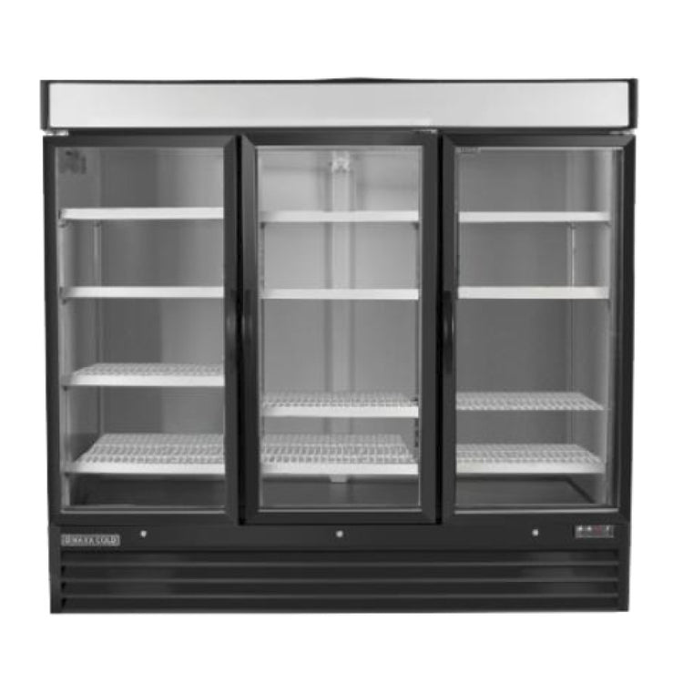 The Maxximum MXM3-72FBHC Maxx Cold X-Series Freezer Merchandiser is a commercial-grade reach-in freezer designed for high-performance food storage and display. Featuring a three-section configuration with triple pane glass self-closing doors, it provides 72 cubic feet of capacity ideal for mid-volume foodservice environments. Constructed with a durable black powder-coated steel exterior and powder-coated aluminum interior, this unit ensures longevity and resistance to wear. The refrigerated system is bottom-mounted with a 1-1/4 HP compressor, facilitating efficient cooling. Key features include electronic thermostat control, a digital LED temperature display for precise temperature management, and LED lighting to enhance product visibility. Equipped with (12) coated wire shelves, it supports organized storage, making rotational product placement straightforward and accessible. The unit complies with safety and sanitation standards, with self-contained refrigeration for simplified maintenance and installation in commercial kitchens or retail settings requiring reliable frozen product presentation.
