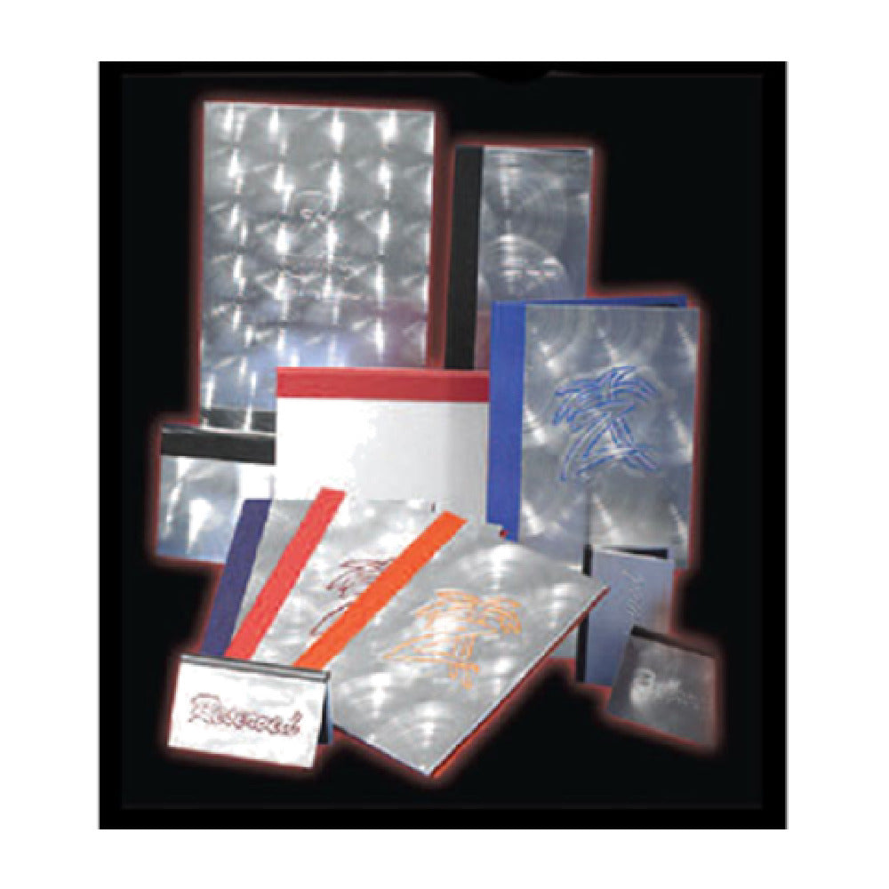 The Menu Solutions MAL130A Menu Cover is a commercial-grade display accessory designed for professional foodservice environments. Crafted with a durable aluminum front, this menu cover holds 5-1/2" x 8-1/2" inserts and features a triple panel continuous design with three viewing panels, enabling simultaneous display of multiple menu pages. It includes a logo imprint area of up to 45 sq. inches, with all associated plate, die, embossing, and setup fees incorporated. This model is ideal for establishments requiring clear, organized menu presentation and easy maintenance, suitable for use in restaurants, cafes, and hospitality settings. Its precise construction ensures durability and seamless workflow integration for technical operations requiring reliable menu display solutions.
