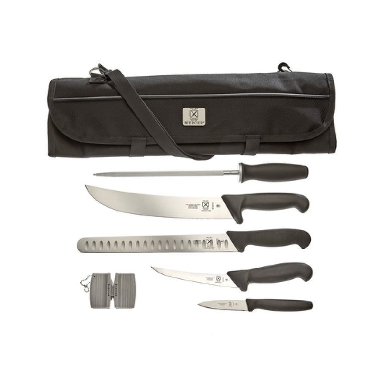 The Mercer Culinary M13750 BBQ Competition Set is a professional-grade knife kit designed for high-performance food preparation in commercial kitchens, catering, and culinary competitions. This 7-piece set includes essential knives such as a 3" slim paring knife, 5.9" boning knife, 11" carving knife, 10" cimeter, and a 10" steel for honing, all crafted for durability and precision. Encased in a protective 7-pocket roll, this set ensures organized, accessible storage, suitable for frequent use in upscale restaurants, catering operations, and competition environments. The knives are NSF-certified, emphasizing safety and sanitation during rigorous culinary activities. With sharp edges and corrosion-resistant materials, the Mercer Culinary M13750 set offers a technically optimized solution for detailed cutting, deboning, and carving tasks with superior edge retention and ergonomics.