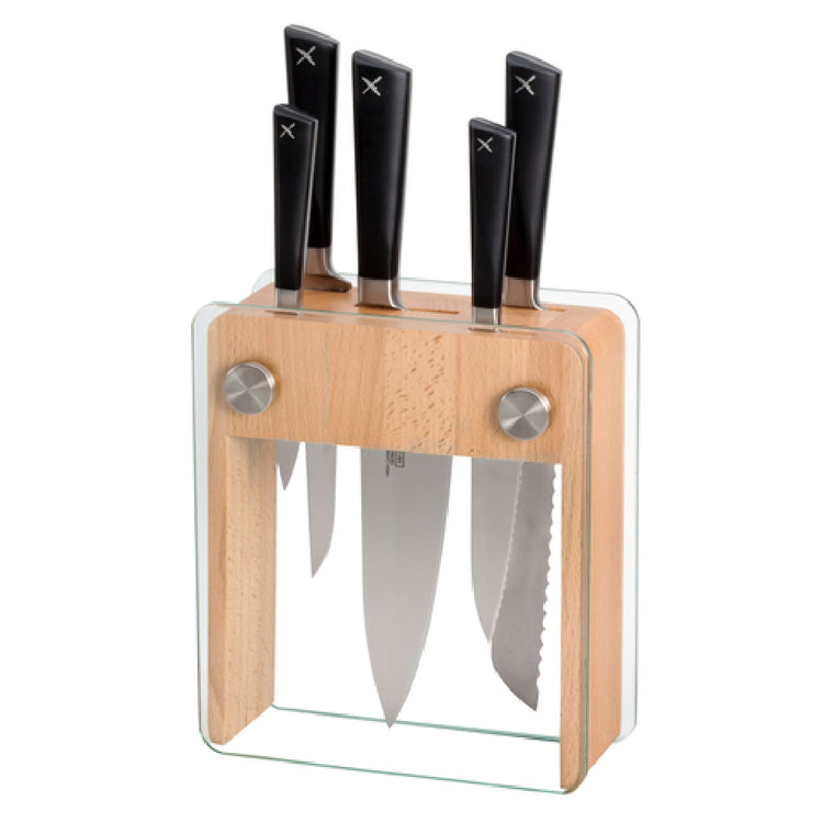 The Mercer Culinary M19105 ZüM® Knife Glass Block Set is a professional-grade 6-piece knife collection designed for commercial foodservice environments. Constructed with high-carbon German steel blades, the set features precision-forged construction for enhanced durability and edge retention. The included 6" wavy edge utility knife is distinguished by its blade design, optimized for versatile cutting tasks. Packaged in a sturdy rubberwood and tempered glass knife block with a heavy base, this set offers an organized, space-efficient solution for culinary professionals requiring reliable, restaurant-ready knives with ergonomic POM handles. It is engineered for high-performance application in busy kitchens, with blades suited for precision cutting and slicing operations.