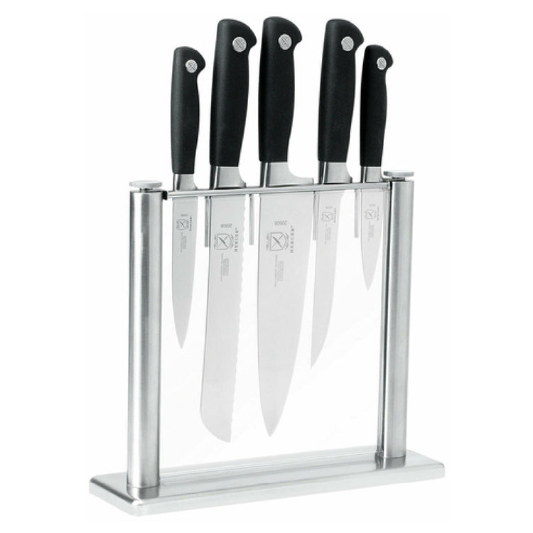 This Mercer Culinary M20000 Genesis® Knife Set features a stainless steel and tempered glass construction, with blades crafted from high-carbon, German steel for long-lasting sharpness and corrosion resistance. The set includes five essential knives: a 5" utility knife, 8" bread knife, 8" chef’s knife, 6" boning knife, and a 3-1/2" paring knife, collectively weighing 9.67 lbs. The stainless steel knife block provides a robust, easy-to-clean housing with a heavy base for stability. The set is NSF certified and designed for moderate-to-high workload environments, supporting efficient food prep with precise cutting performance. Its dimensions facilitate seamless storage in standard commercial kitchen setups, with maintenance requiring regular hand cleaning with non-abrasive tools to preserve blade integrity.