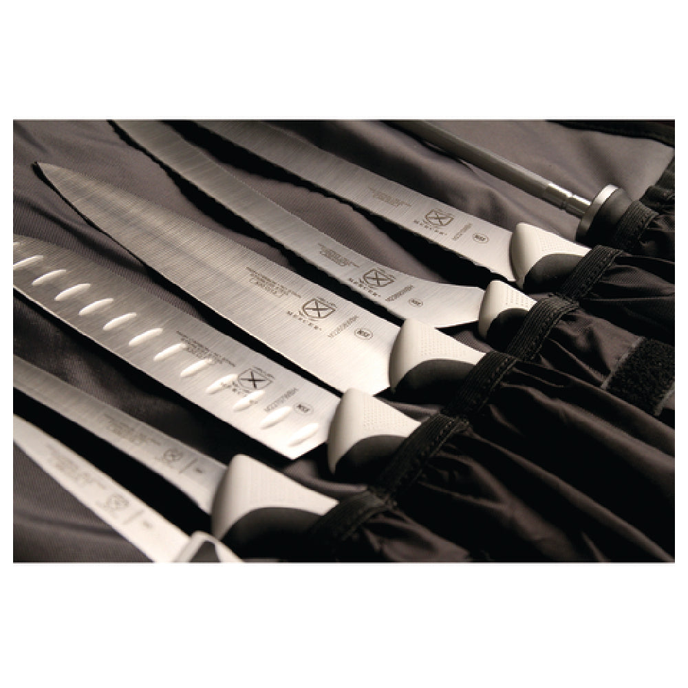 A commercial knife set is a professionally designed collection of high-quality blades and tools intended for use in restaurant, catering, and foodservice operations. The Mercer Culinary M21821WH Millennia® Knife Roll Set includes essential knives crafted for durability and precision, optimized for high-volume or moderate throughput kitchens. Typical applications include prep stations, catering services, and culinary education environments where organization, quick access, and sanitation are key. These sets feature ergonomic handles, corrosion-resistant blades, and portable storage, making them suitable for demanding operational settings and frequent transportation within professional kitchens.