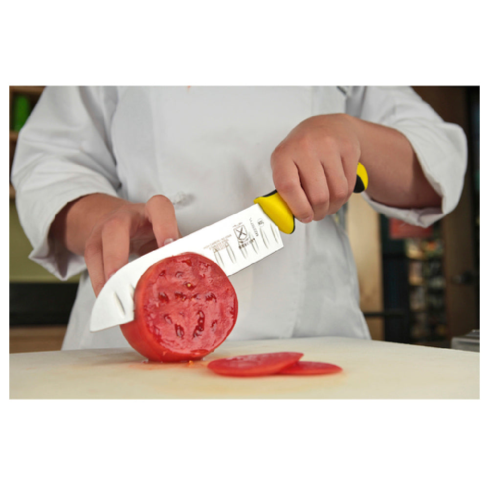 Designed with professional chefs in mind, the Mercer Culinary M22707YL Millennia Colors® Santoku Knife stands out with its sharp high carbon Japanese steel blade, lightweight stamped construction, and safety-oriented handle design. Its vibrant color coding improves kitchen organization and safety, while granton edges enhance cutting efficiency. The engineered grip and finger guard provide superior control during repetitive prep, making it a reliable choice for demanding foodservice environments. This model's ergonomic features and durable materials support long-term performance, operational safety, and ease of maintenance compared to standard chef knives.