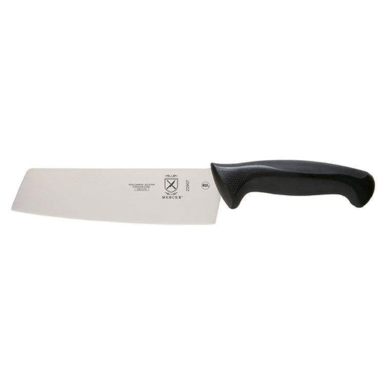 The Mercer Culinary M22907 Nakiri vegetable knife features a 7-inch high carbon steel blade with a smooth edge, offering precise slicing for vegetable preparation. The stamped construction permits easy handling and quicker responsiveness, with a total weight of 0.5 lbs suited for extended use. Its handle combines durable polypropylene with Santoprene® for slip resistance, ergonomic comfort, and safety. The knife’s overall dimensions accommodate comfortable grip and control, supporting demanding food prep tasks. Designed for commercial kitchens, it withstands frequent cleaning and rigorous use. The knife operates effectively across typical kitchen temperatures, with non-porous, food-safe materials that require straightforward cleaning routines. Dimensions are optimized for maneuverability and precision cutting, making it a reliable tool for professional chefs and prep stations.