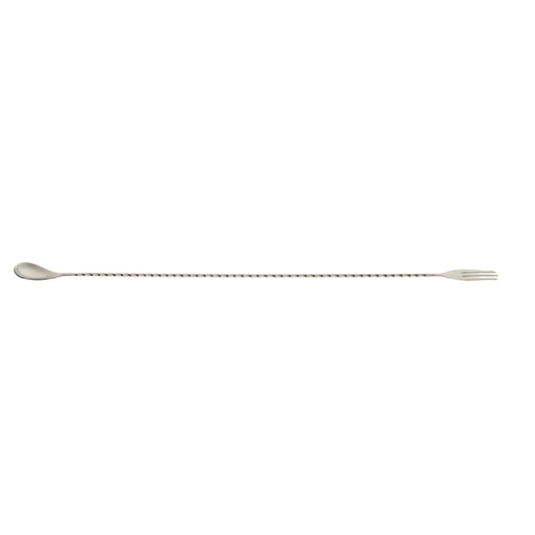 The Mercer Culinary M37017 Barfly® Bar Spoon is a professional-grade bartending tool designed for precise cocktail mixing and beverage service in commercial bars, restaurants, and hospitality settings. Measuring 19-5/8 inches (50 cm) in length, this one-piece stainless steel spoon features a twisted stem for enhanced grip and leverage. The 3-tine fork end enables accurate pouring and stirring, making it an essential instrument for high-volume beverage operations. Its durable 18/8 stainless steel construction ensures longevity, corrosion resistance, and ease of maintenance, making it suitable for rigorous use in busy foodservice environments.