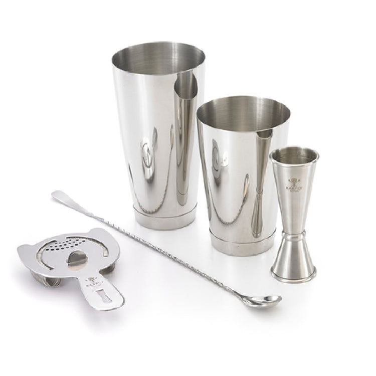 The Mercer Culinary M37101 Barfly® Basics Set is a comprehensive bar accessory package designed for commercial foodservice environments. This 5-piece collection features stainless steel construction, including a full-size and half-size shaker, a 1 oz. x 2 oz. jigger for precise measurement, a 13-3/16" bar spoon, and a heavy-duty spring bar strainer. Engineered for durability and uniform performance, these tools support efficient beverage preparation and presentation, making them ideal for professional bar settings, cocktail stations, and high-volume venues requiring reliable bartending equipment. The set’s technical precision ensures consistent results and streamlined workflows in busy commercial kitchens and bars.
