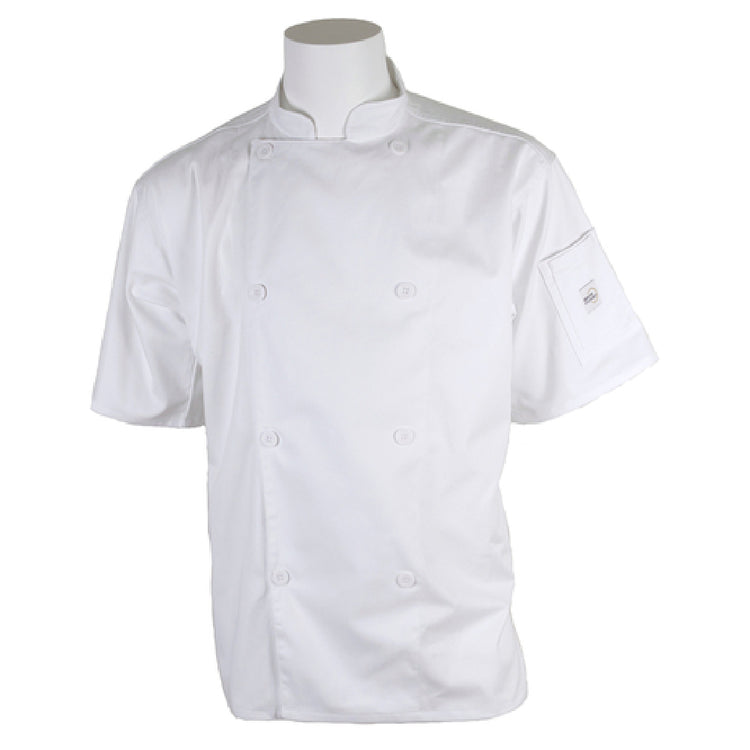 A commercial chef's coat is a professional garment designed for kitchen staff to ensure sanitation, safety, and comfort during food preparation. Typically constructed from durable, easy-care fabrics like poly/cotton twill, these jackets provide a protective layer against heat, spills, and stains. The Mercer Culinary M61012WHXS Genesis Unisex Chef Jacket Short Sleeve with (8) traditional buttons is installed in various foodservice environments such as restaurants and catering operations, making it ideal for kitchen staff requiring reliable, practical apparel that supports hygiene and efficiency during mid-volume food production processes.