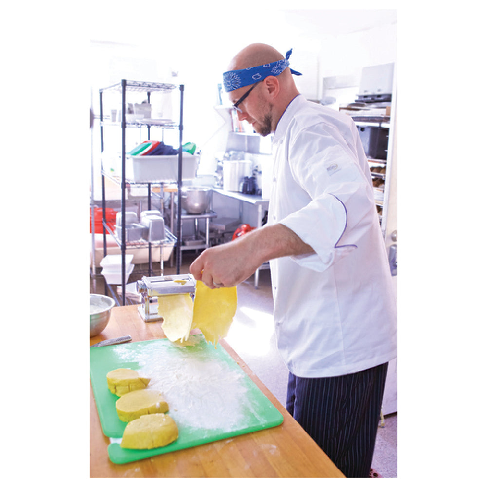 Usage setup includes ensuring ample clearance for washing and drying, as well as inspection of fabric integrity after multiple cycles to maintain appearance and hygiene standards. The utility shoulder pocket facilitates tool storage, while earbud opening supports communication needs during service. The garment’s design emphasizes sanitation compliance and durability for daily use in busy culinary operations, ensuring reliable performance and ease of maintenance across multiple work shifts.