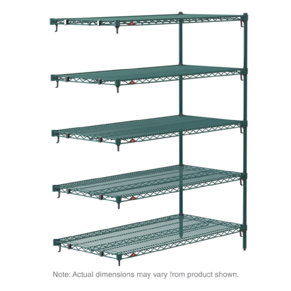 This commercial add-on shelving unit is engineered with a robust epoxy-coated finish, providing corrosion resistance and antimicrobial protection via Microban®. It measures 36 inches wide, 18 inches deep, and stands 74 inches tall, making it suitable for high-traffic foodservice applications. Constructed with five wire shelves supported by two posts and equipped with two "S" hooks per shelf, the unit offers a total weight of 57 pounds. Its modular design facilitates installation as an extension of existing Metro Super Erecta® shelving, supporting a wide range of storage needs in kitchens, prep stations, and storage rooms. The epoxy finish ensures ease of cleaning and maintains hygiene standards, vital for sanitary food handling and storage operations.