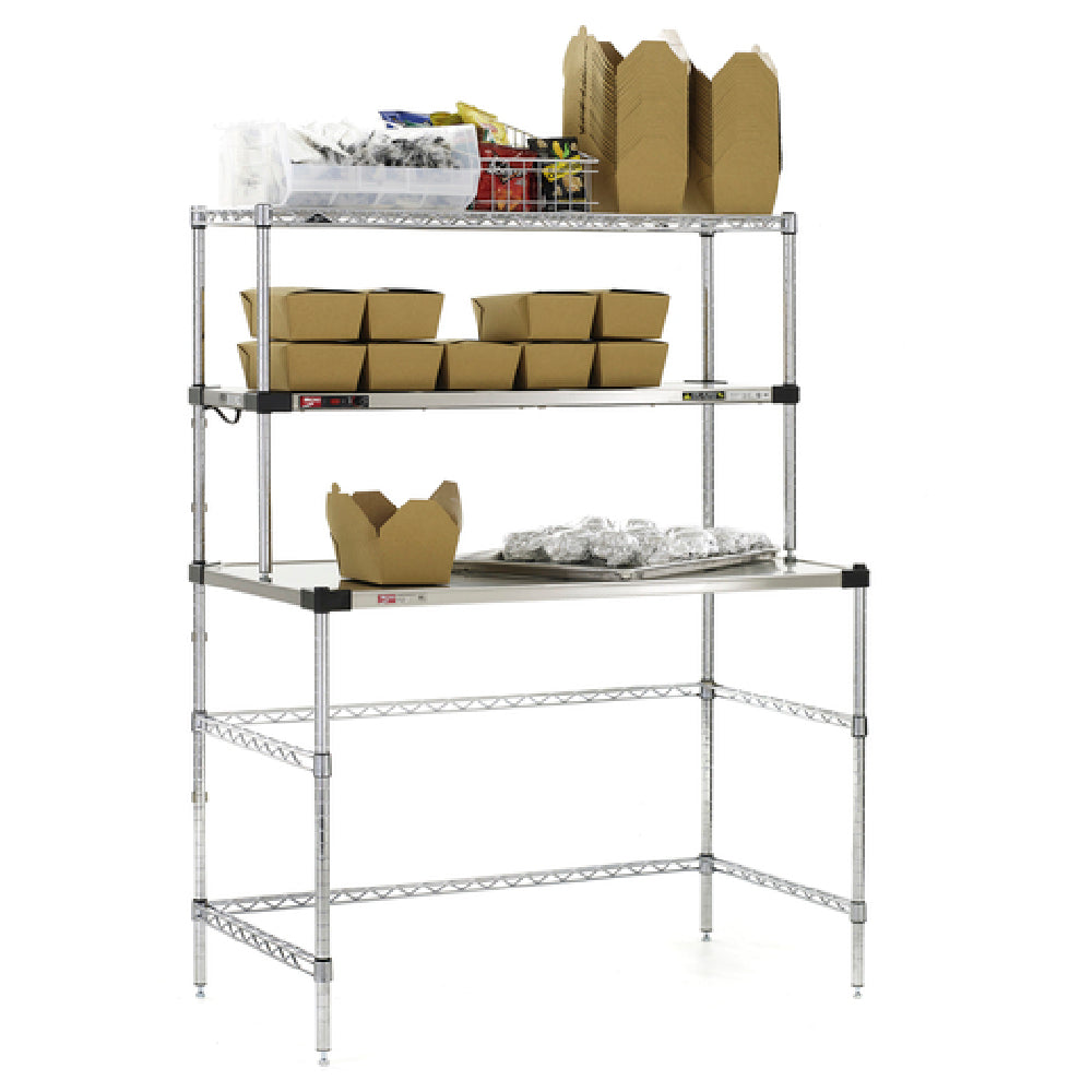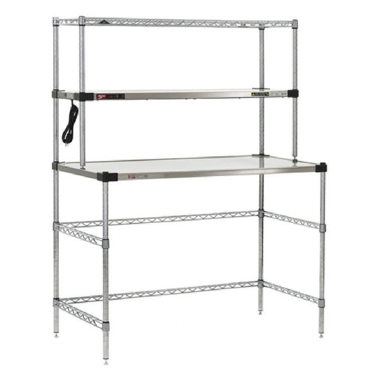 Metro, EZHS48W-KIT, Super Erecta® Workstation with Hot Open Heated Shelf, 3-sided open base, 48"W x 24"D stainless steel work surface, (1) 48"W x 14"D heated shelf, adjustable thermostat to 200°F max temperature, (1) overhead wire shelf, chrome plated wire & posts, 120v/60/1-ph, 400 watts, 3.4 amps, cord & NEMA 5-15P, NSF, cULus, Made in USA