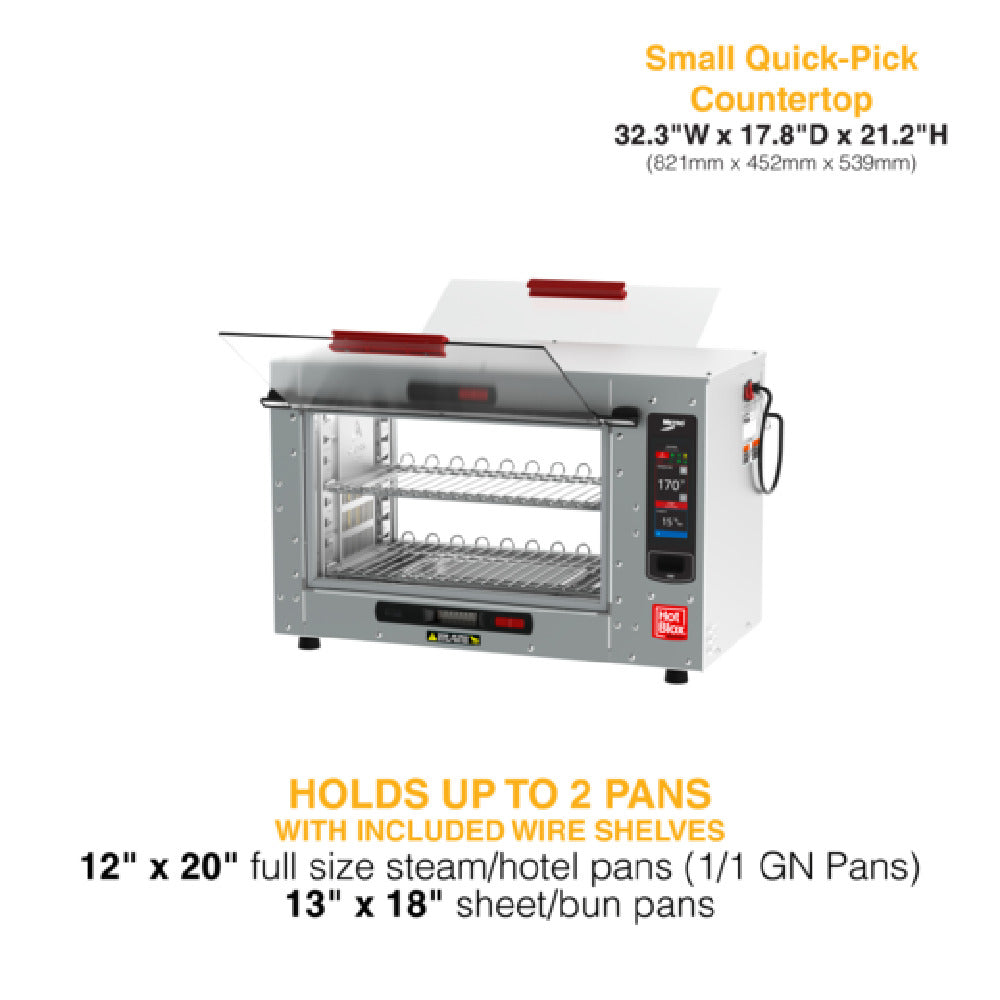 The HotBlox Xpress S4 quick access holding cabinet offers precise thermostatic control and insulated construction for consistent food temperature maintenance. Its clear flip door allows for easy visual checks, while touchscreen controls facilitate quick adjustments. Designed for counter installation, it accommodates half-size sheet pans and full or fractional steam pans, making it ideal for high-turnover foodservice stations. The unit’s aluminum construction ensures durability and ease of cleaning, supporting efficient sanitation and maintenance routines in busy commercial kitchens.