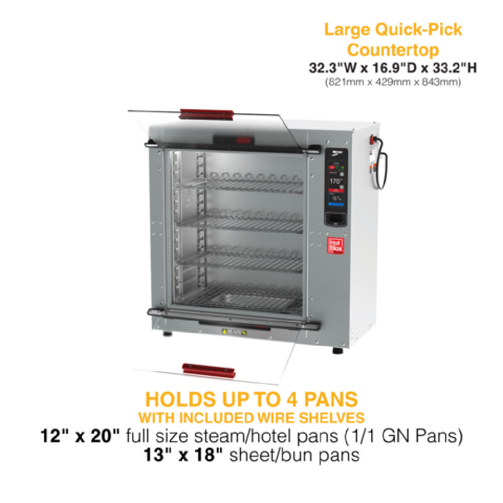 The Metro HBCS8-T HotBlox Xpress S8 Quick Access Holding Cabinet is a premium countertop insulated food holding unit designed for precise temperature maintenance in commercial kitchens. Featuring four adjustable shelves, clear flip doors, and touchscreen controls, it streamlines food service workflows by providing quick access to prepared items while preserving optimal temps. Constructed with all aluminum exterior and equipped with thermostatic controls, this model ensures durability and reliable performance at 875W on a 120V/60Hz single-phase power supply, making it an ideal solution for high-efficiency foodholding in professional foodservice environments.