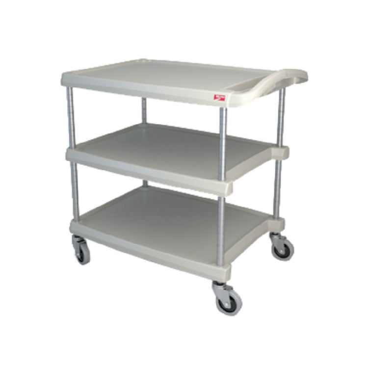 A commercial utility cart is a mobile storage and transport device made from durable materials designed to facilitate material handling within foodservice, healthcare, or industrial environments. Typically featuring multiple shelves or compartments, it allows for organized movement of supplies, ingredients, or tools. The Metro MY2030-34G utility cart, with its NSF-certified heavy-duty plastic shelves, open base design, and resilient casters, is suitable for applications such as ingredient transport, dishware handling, or supply distribution in busy commercial kitchens and cafeterias—enabling efficient workflow and sanitation in medium-volume foodservice settings.