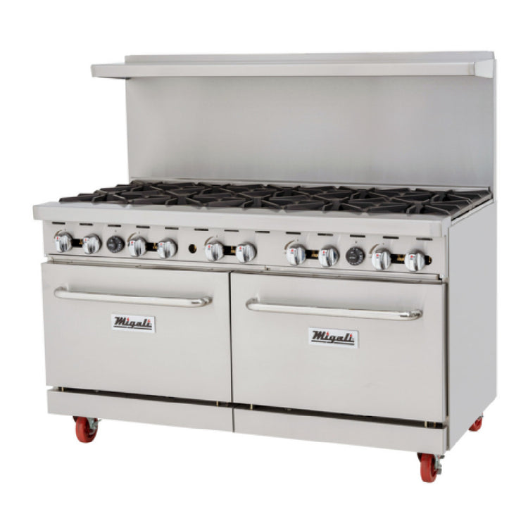 A commercial range is a high-capacity cooking appliance designed for professional foodservice kitchens, featuring multiple burners and ovens to support continuous large-scale food preparation. The Migali Industries C-RO10B-LP Competitor Series® Range is a robust 60-inch gas model equipped with (10) open burners and dual ovens, ideal for restaurant kitchens, catering operations, or institutional foodservice environments. Its all stainless steel build, exceptional heat output, and durable cast iron grates make it suitable for high-volume cooking and demanding daily use. Typically installed with appropriate ventilation and gas connections, this range optimizes workflow for large-scale culinary operations, ensuring efficiency and consistent performance in busy commercial kitchens.
