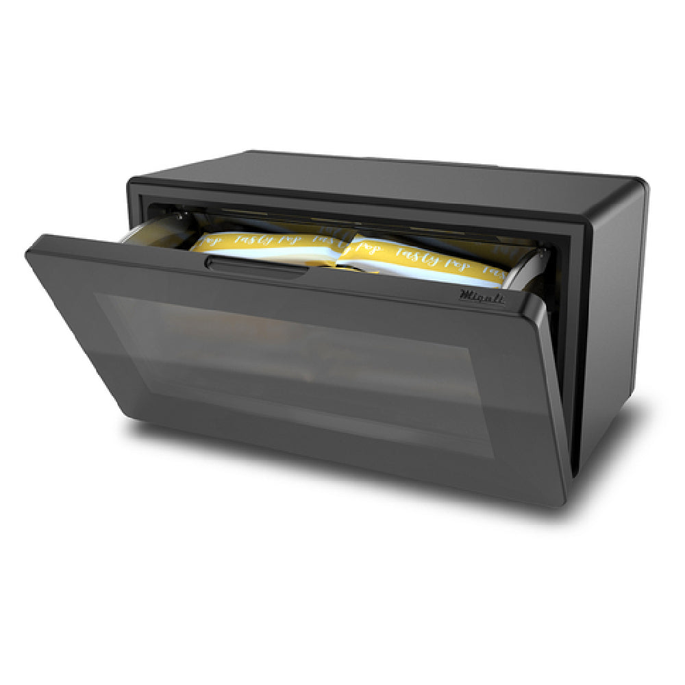The G4.4RG model from Migali Industries features a self-contained refrigeration system utilizing environmentally friendly R744 refrigerant, operating on 110V/60Hz single-phase power with a 3.5-amp draw. It employs Phononic solid-state cooling technology for consistent temperature regulation within the 38°F (3.3°C) set point, with a typical power consumption of approximately 45 watts. Constructed with a durable black painted steel exterior and a tempered glass sliding door, this unit measures 19.7 inches wide, 10.7 inches deep, and stands 10.3 inches high, weighing 42 lbs for straightforward placement and maintenance. The interior includes a clear polycarbonate bin and integrated lighting to display products clearly while maintaining efficient airflow and temperature stability. Certified by NSF and UL, it incorporates safety and sanitation features suitable for demanding commercial environments.