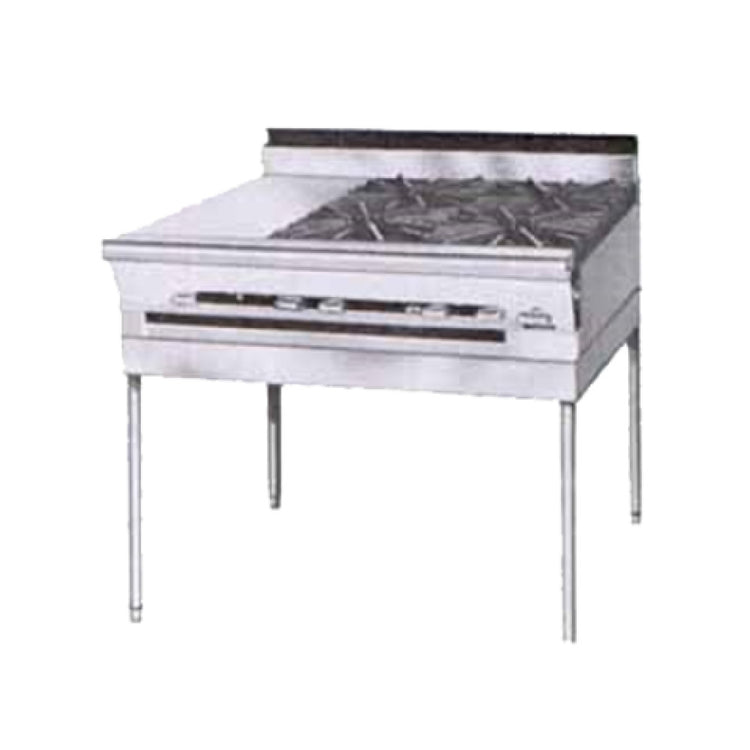 The Montague Company M36-4E Legend™ Heavy Duty Range Gas 36" is a commercial-grade cooking appliance designed for high-performance foodservice environments. This 36-inch heavy-duty gas range features a durable stainless steel front and a 4-inch flue riser, ensuring longevity and resistance to daily kitchen wear. Its layout includes a single 12-inch even heat hot top on the left for precise simmering and sautéing, complemented by four 30,000 BTU open burners on the right for rapid boiling and high-heat applications. The robust construction and high-output burners support mid-volume restaurant kitchens, institutional dining halls, and catering operations seeking consistent, reliable heat delivery. Its integrated design simplifies workflow while meeting demanding operational standards, making it an essential piece of commercial kitchen equipment.