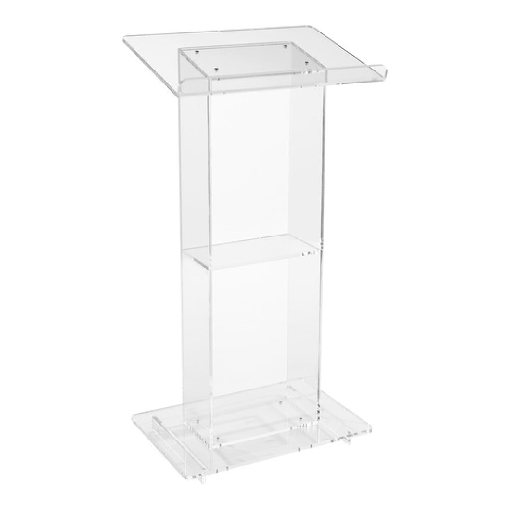 This floor lectern is optimized for professional speech delivery, featuring a transparent acrylic surface that resists scratches and simplifies cleaning. Its mid-shelf provides additional storage for documents or presentation tools, while the paper/book stop secures materials during use. Crafted from high-quality materials, it ensures long-term durability in busy environments, with a design that facilitates quick setup and maintenance. Ideal for conference rooms, educational institutions, and hospitality venues, it supports clear sightlines and organized workflows for presenters managing multiple materials. The precise measurements and sturdy construction cater to moderate-traffic usage within commercial settings.