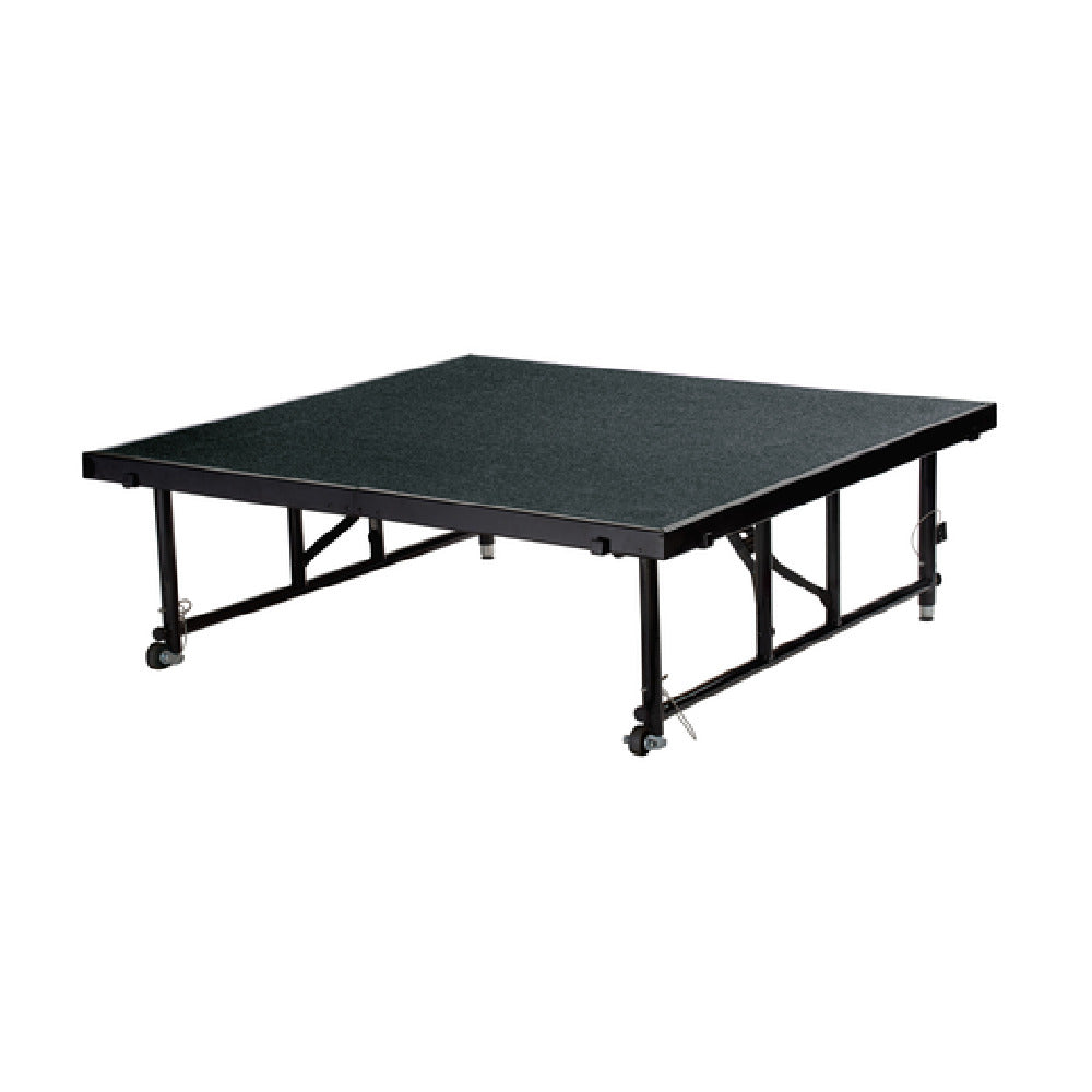 The TFXS48481624 stage platform from National Public Seating features a square shape measuring 48 inches in width and depth, with an overall weight of 92 pounds. The platform’s adjustable height ranges from 16 to 24 inches via robust 14-gauge steel legs, ensuring stability for applications like theater staging, trade shows, or conference presentations. Its construction employs durable materials capable of supporting moderate workloads, with a surface designed for compatibility with heavy equipment and consistent use. The platform is supported by two integrated roll-on casters that facilitate easy movement across smooth flooring surfaces. Designed for portability and stability, the unit generally ships within 1 to 2 days, with no additional certification requirements specified. It maintains a commercial-grade build suited for frequent deployments in professional settings, featuring a square shape ideal for versatile staging configurations.