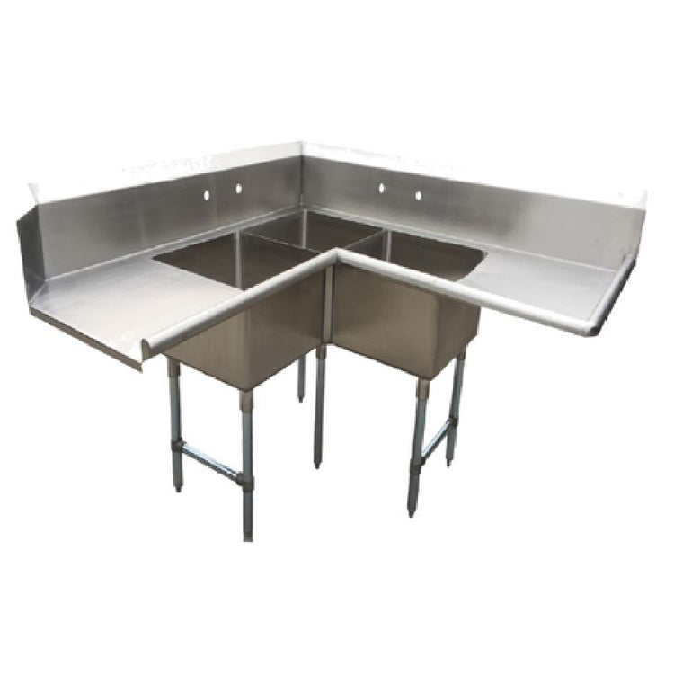 NBR Equipment, SDT3C-202012R20, Economy Corner Dishtable, three-compartment, 65-3/4" machine to corner, 67-1/4" corner to edge, 28-3/4" working depth, 43-3/4"H overall size, (3) 20"W x 20" front-to-back x 12" deep compartments, (2) 20" drainboards on left & right, right to left into dish machine, 9"H backsplash with 45° top & 2" return, (2) sets of splash mount faucet holes with 8" centers, 3-1/2" die-stamped drain openings, 18/300 series stainless steel construction, galvanized bracing, legs & gussets, adjustable plastic bullet feet, NSF